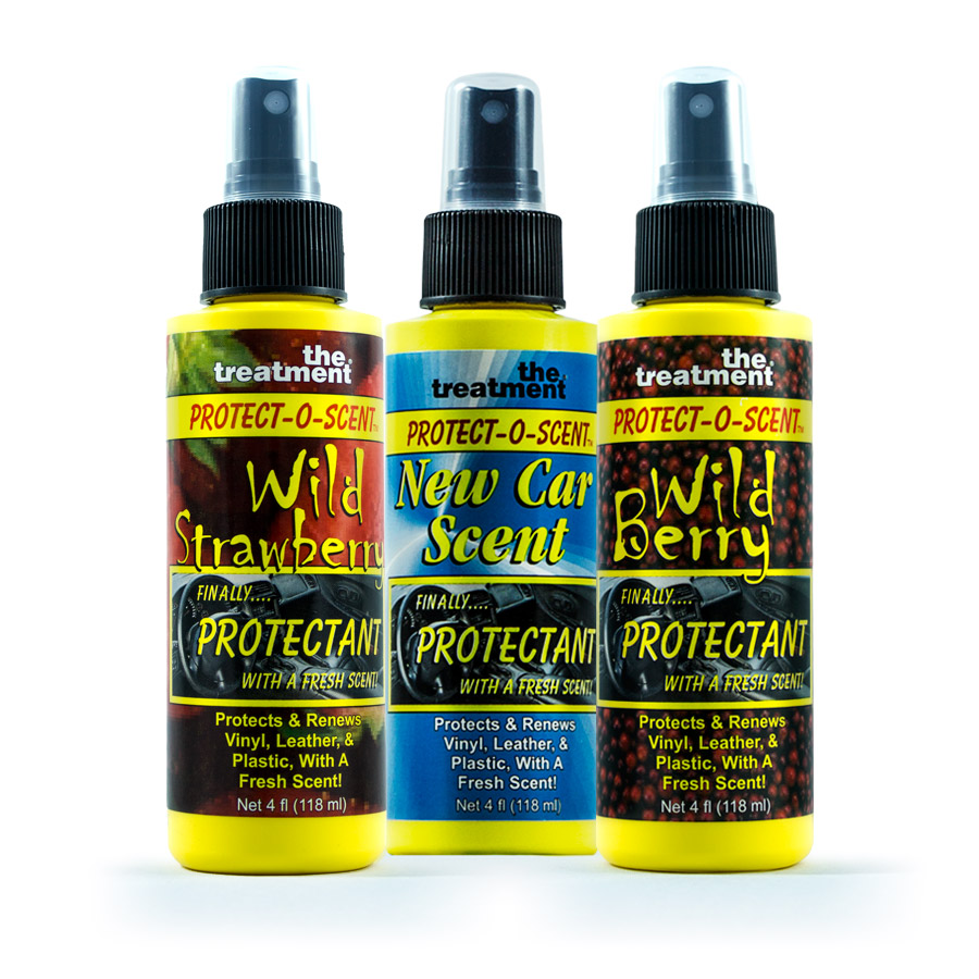 Protect-O-Scent®: The famous The Treatment® Protectant shine, but with 3 new fresh clean scents. As good as air fresheners, but you get a great protectant too! All-purpose, water based dressing that is non-toxic and solvent free. This product is exceptional in its ability to handle multiple surfaces with the same GREAT results. Vinyl/leather protectant restores color to all rubber and vinyl surfaces with an easy wipe on – wipe off application.